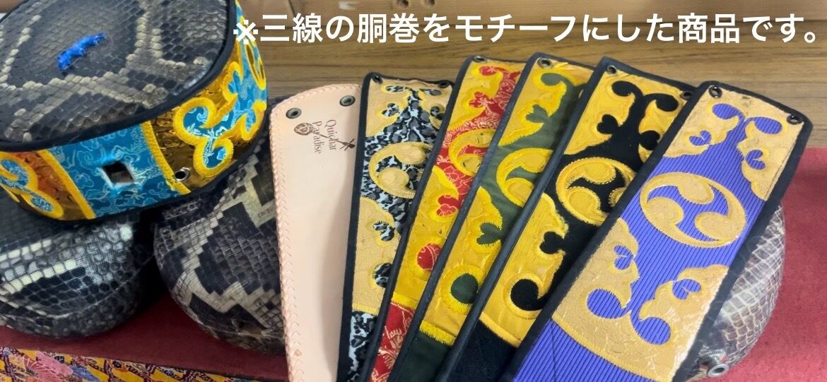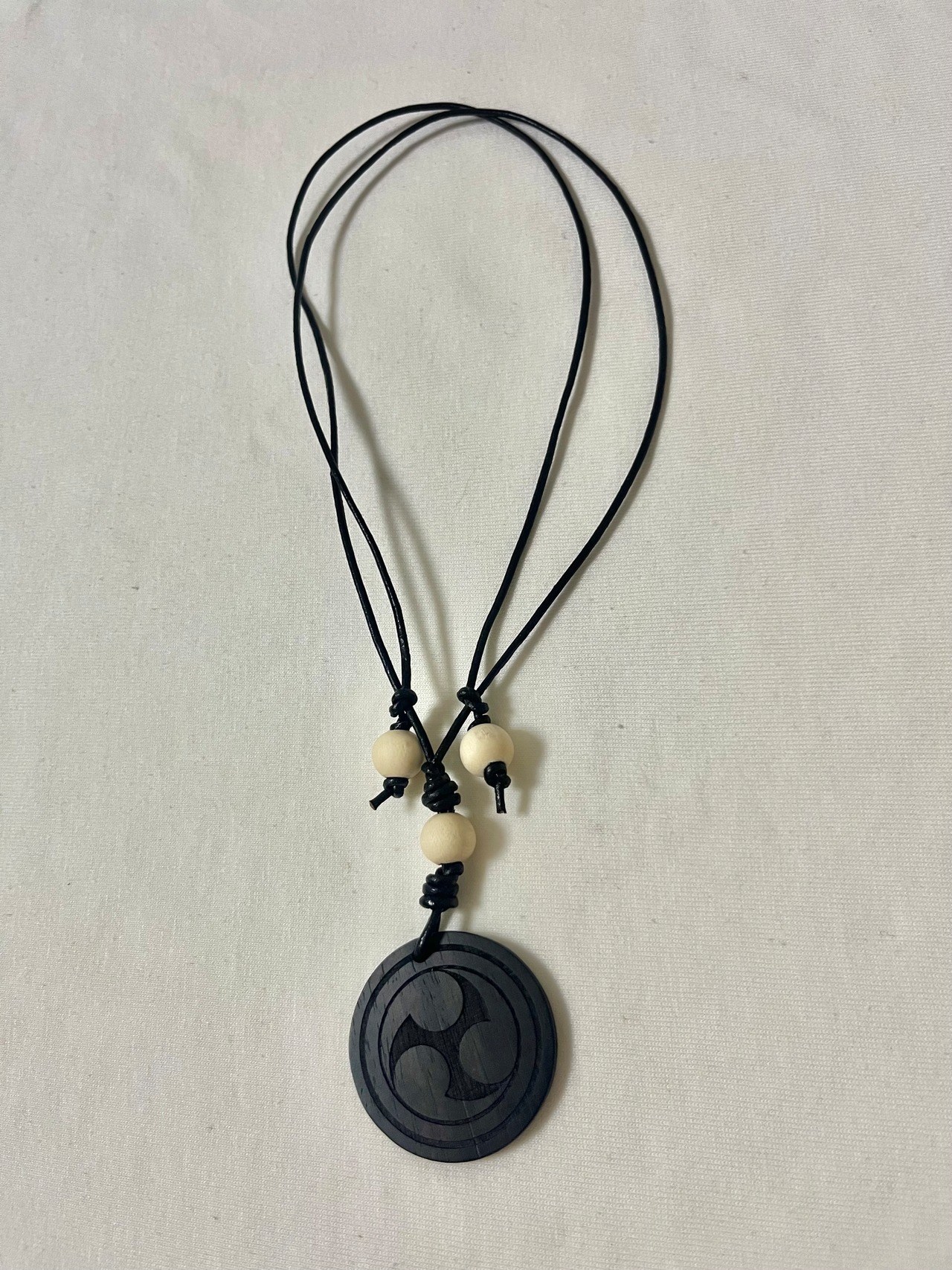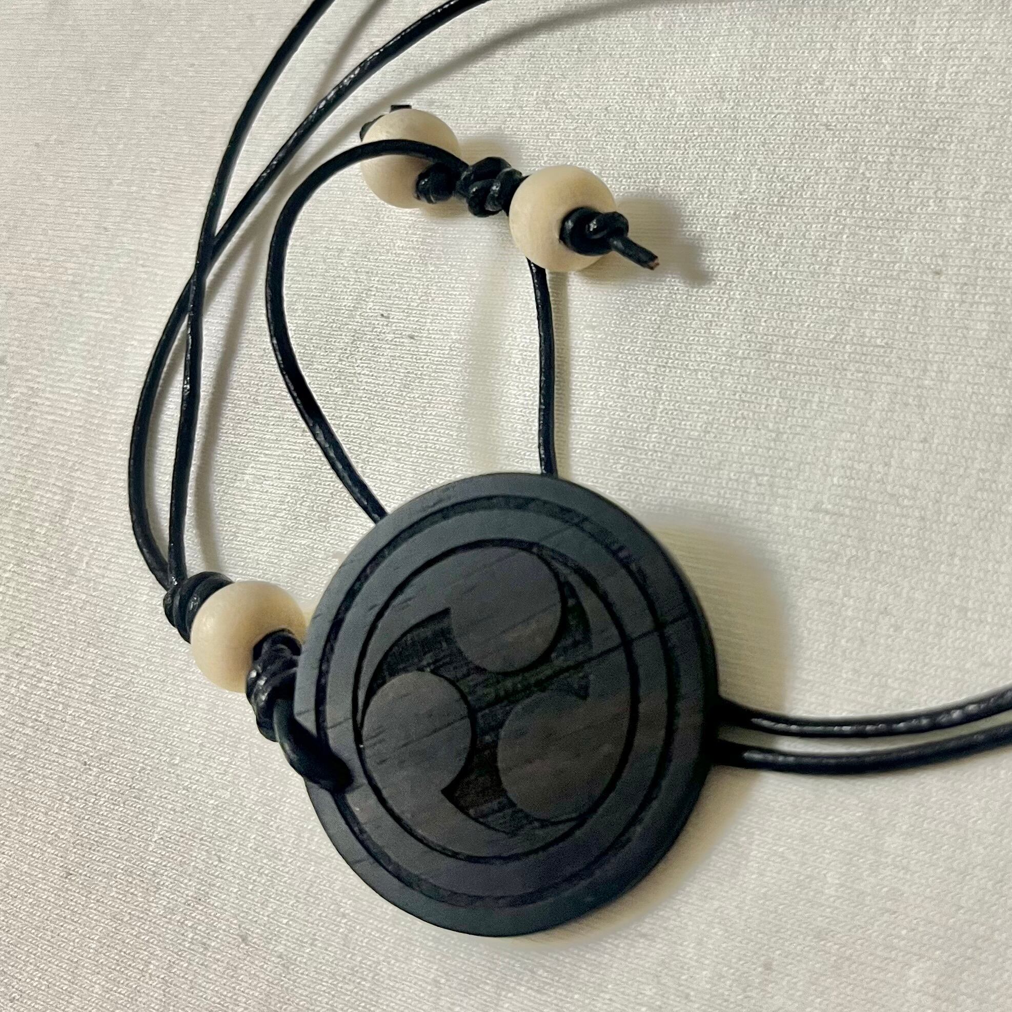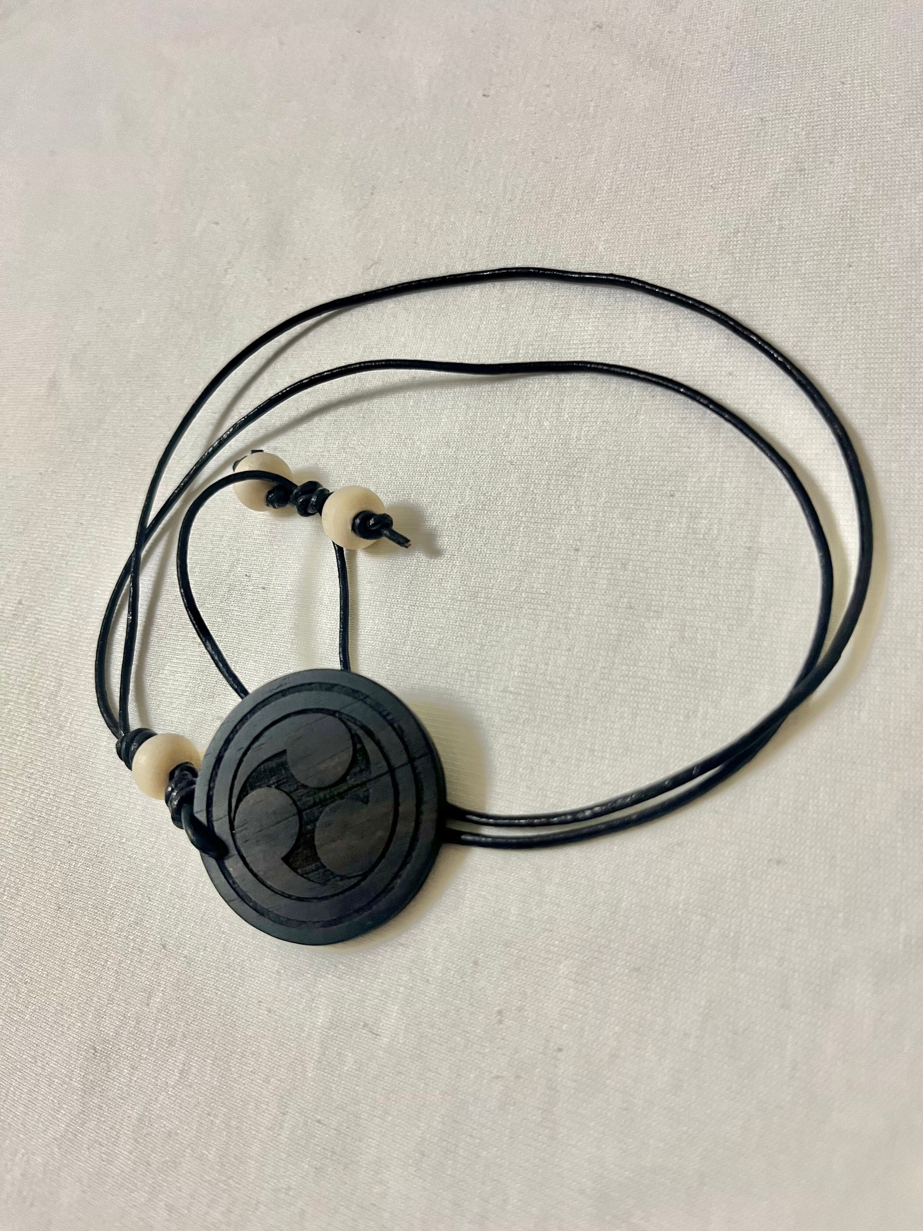 沖縄の楽器・三線のティーガ(胴巻)でよく見るマークを長さ調節可能な革紐ネックレスにしてみました。材料が手に入った時のみの製作となります。