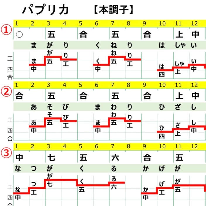 米津玄師『パプリカ』の本調子・声楽譜付きの横書き工工四です。