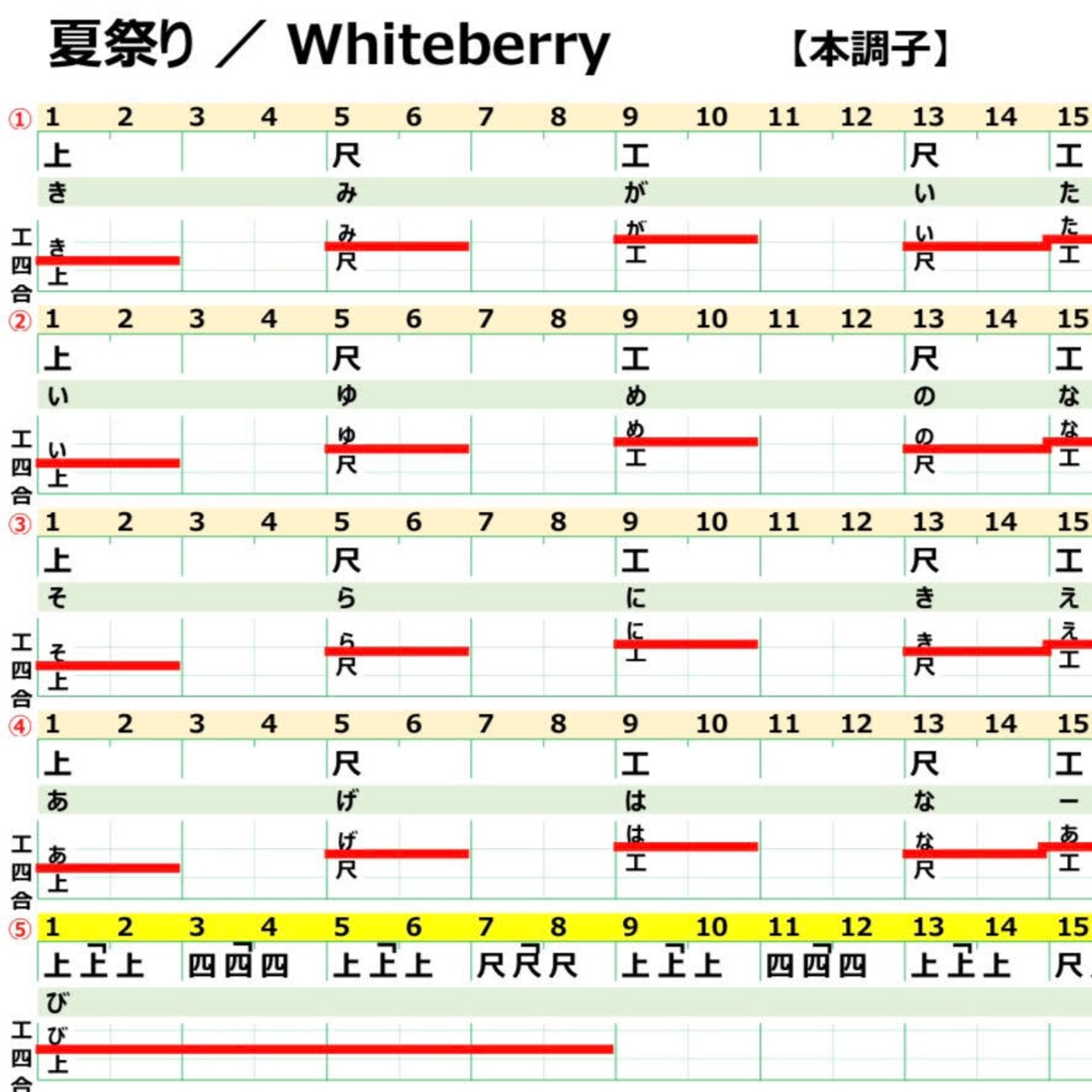 Whiteberry『夏祭り』の本調子・声楽譜付きの横書き工工四です。