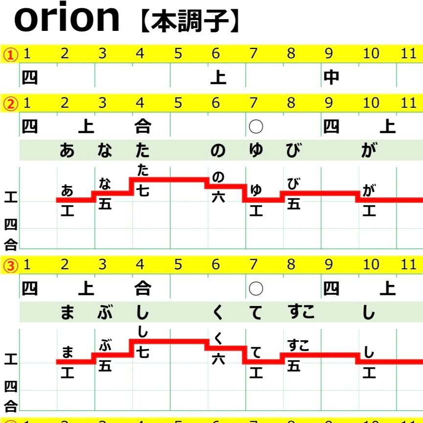 米津玄師『orion』の本調子・声楽譜付きの横書き工工四です。